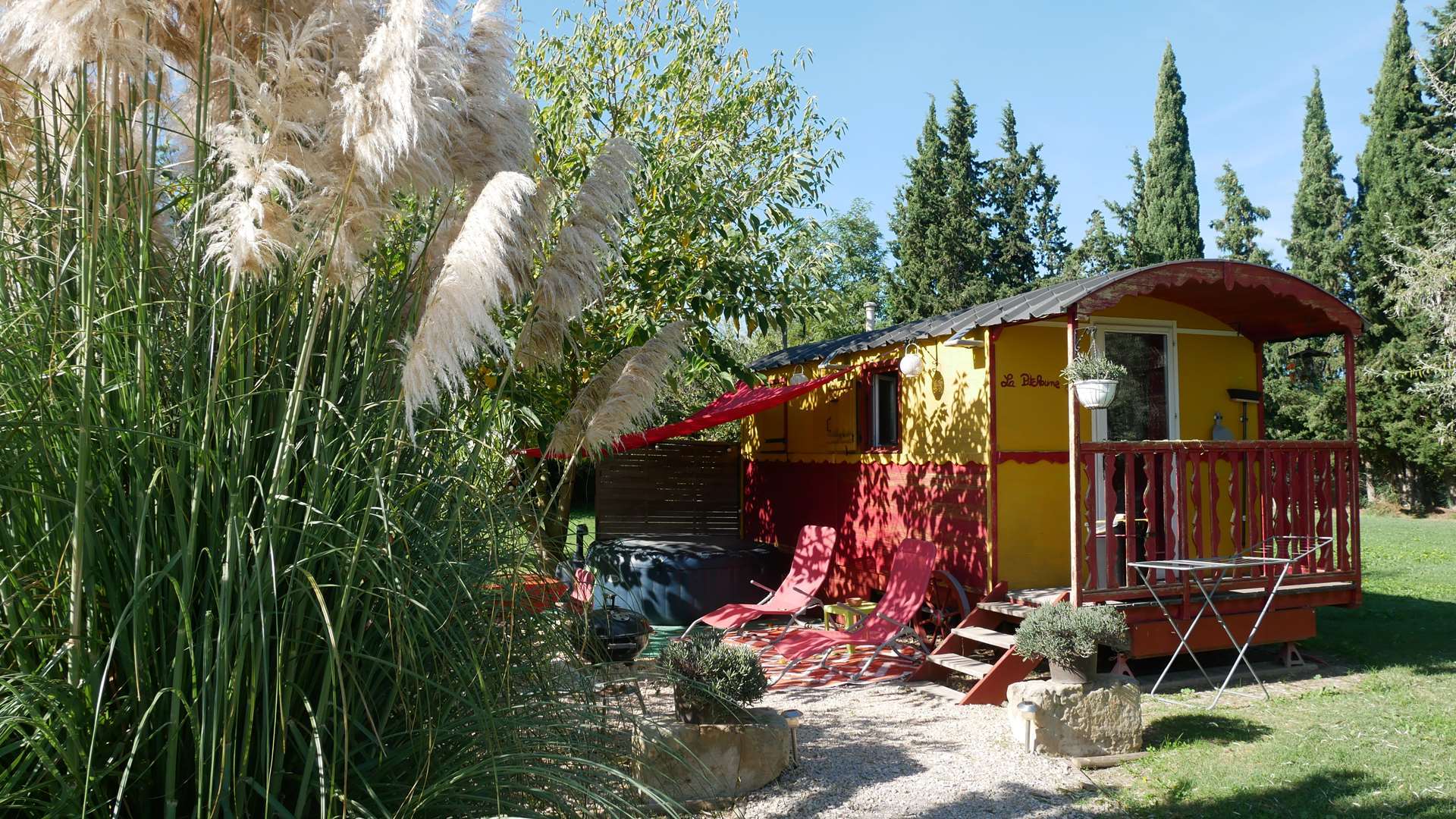 Roulotte Bohèmienne: LA PITCHOUNE Venez passer quelques jours de repos au MAS MAURANE, dans sa roulotte bohémienne LA PITCHOUNE, CLIMATISEE, isolée pour l’hiver avec chauffage, équipée d’un frigo, micro-onde, bouilloire, cafetière, plaques chauffantes, vaisselle, télé, etc.